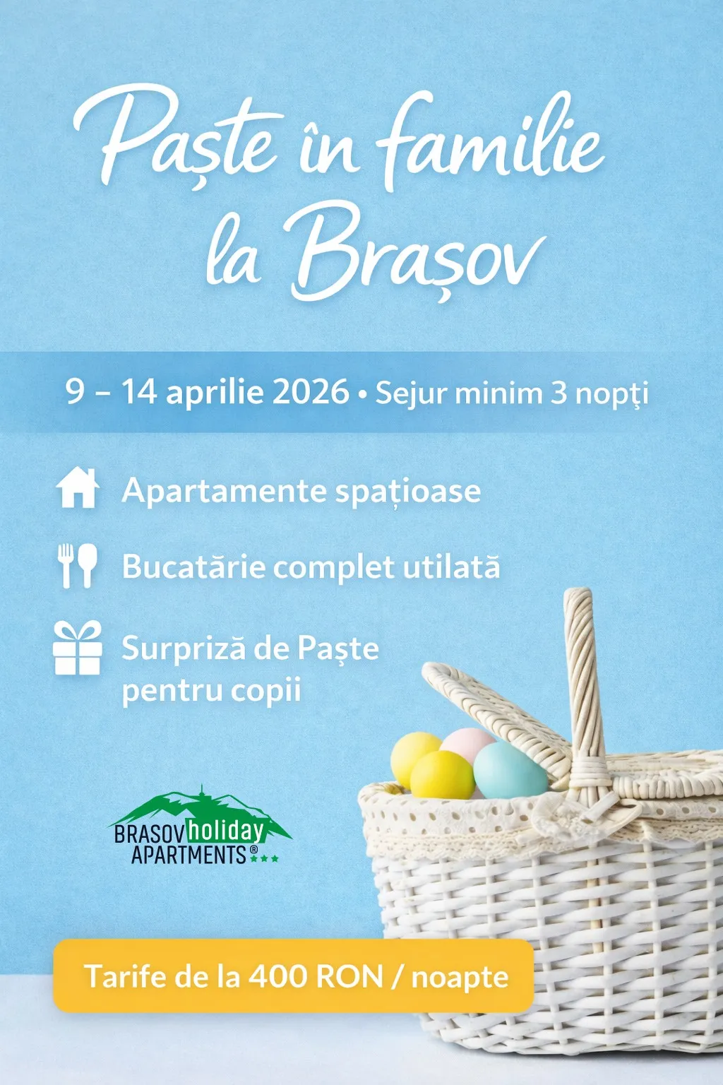 Perioada Paștelui este una dintre cele mai solicitate pentru cazare în Brașov. Rezervă din timp apartamentul potrivit pentru familia ta și bucură-te de sărbători într-un spațiu confortabil și modern.